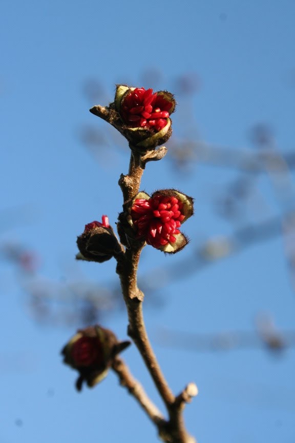 Way up at the top of the garden is a Parrotia persica, which I’ve never seen listed as a winter interest shrub, but right now it is dotted with tiny little jewel-like pomegranate coloured flowers. It’s not showy, but it is fascinating.
