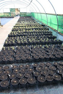 Ten days ago 56 cardboard boxes packed tight with bare root plants arrived and, for lack of a better home, were piled up in the tea room. After a few sprint potting sessions, mostly by Janet and Sally, with fitful contributions from me and Ewan, there are 12 full boxes left to go, a huge pile of empty boxes in the back of the potting shed and half a polytunnel beautifully laid out with happily growing plants.