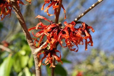 The garden is slowly coming to life too, though as I’ve said before, the original owners didn’t plant it for winter especially. I’ll change that over time. There’s a lovely burnt-orange witch hazel in the cottage garden, but it’s set a long way back in the border and is flat-lit by the sun. Unless I step over the pond to get the sunlight behind it, it just looks like a straggly shrub with a few brown, dead leaves clinging on.