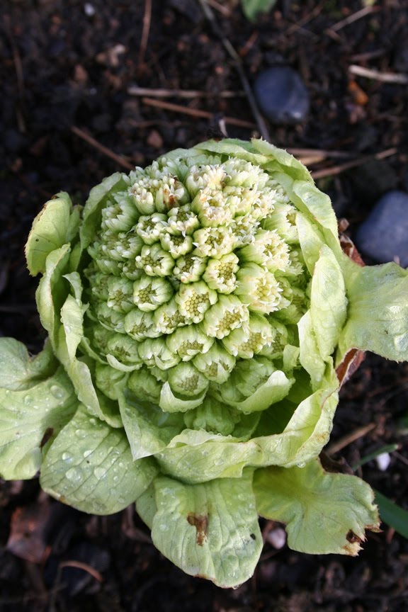 And in the exotic garden, now almost empty but for the bare stems of the Paulownia, the ground is dotted with cricket ball-sized Petasites japonicus flowers, as if tossed onto the soil in some bizarre version of french boules. Very strange they are indeed.