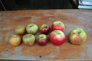 The apple crop is maturing nicely, though I have little confidence in some of the variety names. The tree labelled Spartan probably is, but the fruit is far sweeter and crisper than the tart, under-ripe fruit that I remember from my youth. The tree labelled Discovery is most assuredly not – it looks like another Spartan. The other ‘eater’ is listed as James Grieve, but even this seems unlikely. I compared it with fruit from the demonstration orchard at Reaseheath College and it seems more like Winter Gem. One tree’s identity is beyond dispute – Egremont Russet, and a joy it is indeed. The two cookers on the right are Monarch and Bramley.