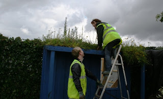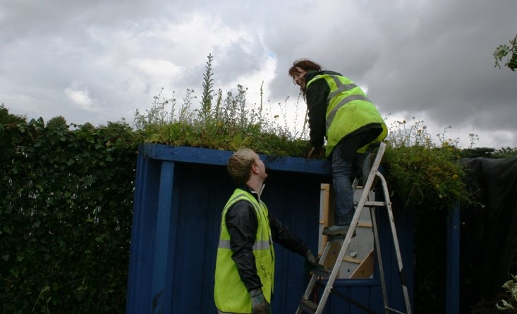 And here’s one from yesterday with veteran back-to-back creator Jacqui Brocklehurst on the sedum roof, sharing a laugh with my trusty assistant Ben Chester.