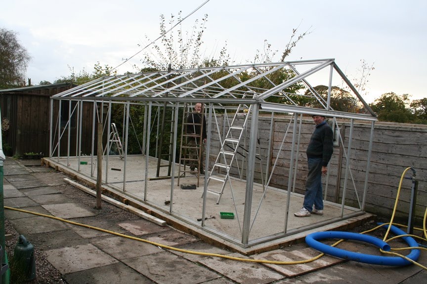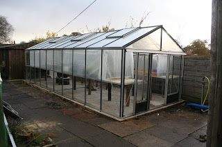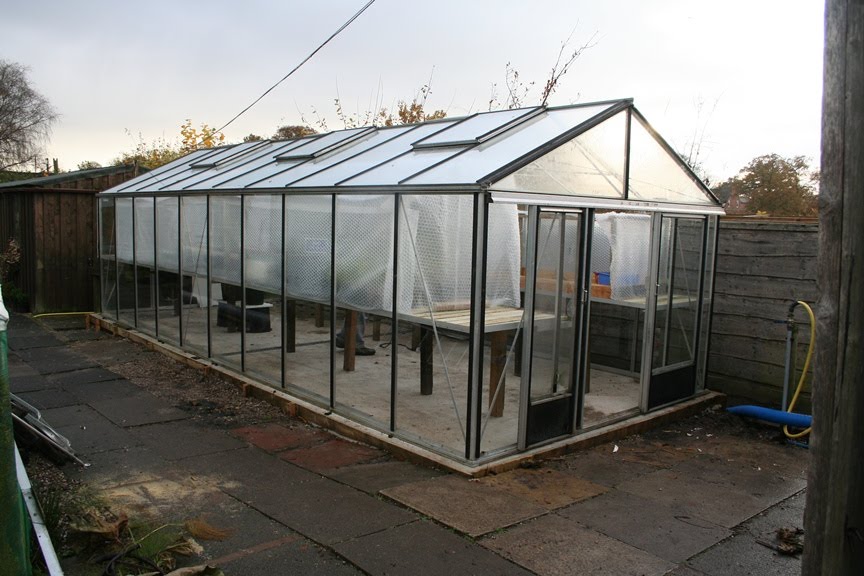 Back in the real world, the old greenhouse has been moved and transformed from a greenish, sagging slime-creature to a sparkling edifice with a straight ridge line (oh, what sublime joy) on a new, flat concrete base. A feat of patience and invention on Pete’s part – assisted by Ewan and me when we were allowed to. Rather than insulate and heat the whole thing, I’ve boxed in one bench with bubble wrap and put the heater in there. Hopefully it’ll keep the heating bill down a bit.
