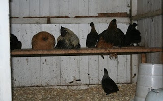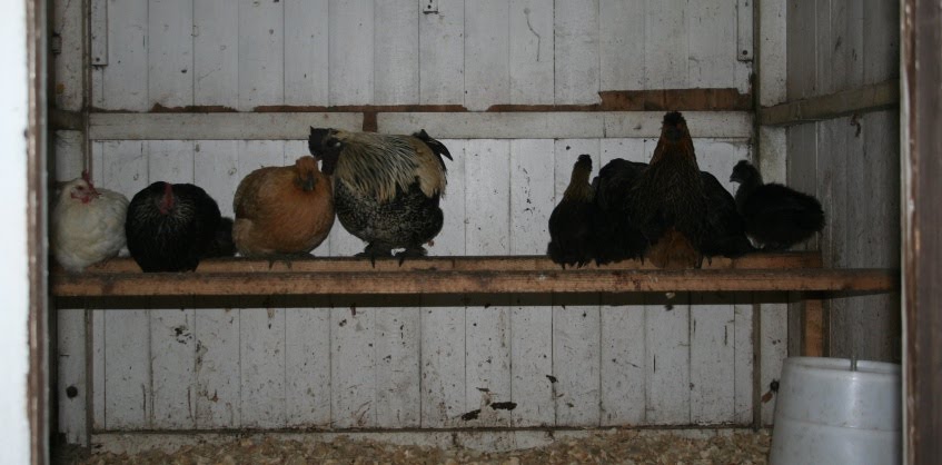 The chicks have made it out of the broody coop and into the hen-house proper. They spent the first few nights sheltering under Mum in one of the nest boxes before she decided to lead them up onto the roost. It took about half an hour of fluttering and over-balancing before they all made it – the two black ones either side and the little brown one tucked under Mum. Note that the other three hens are firmly out of the way at the other end of the perch with the cockerel keeping order in between.