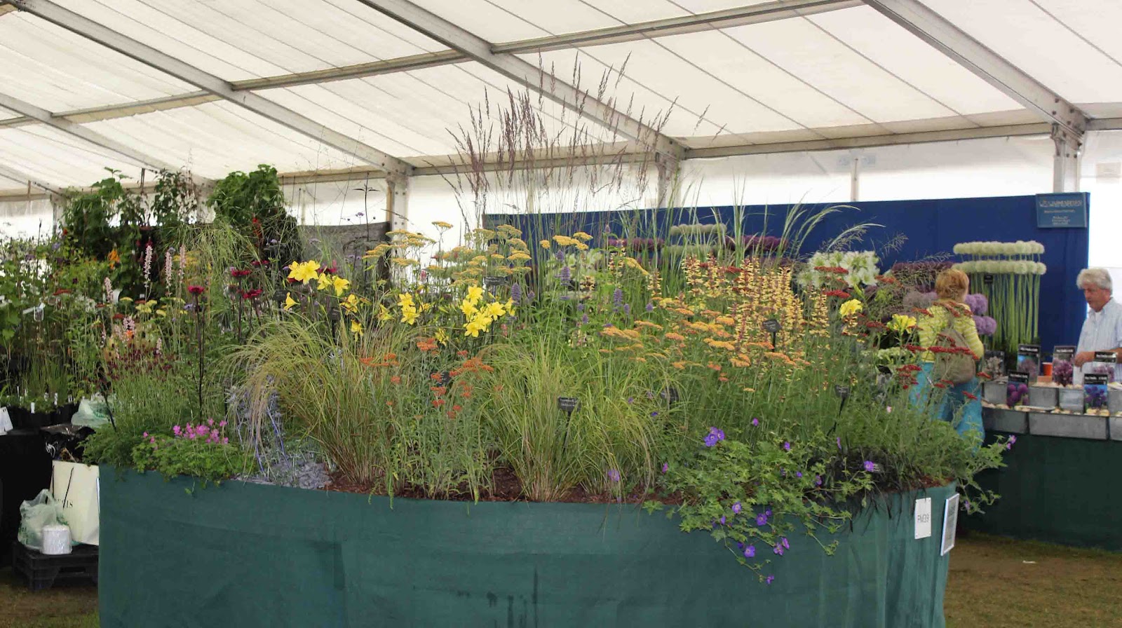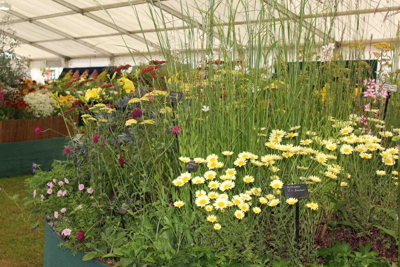 The funny thing is, I got much better PR this year with my bare pass 5/12 display than my near top marks effort last year for which I got absolutely zilch, not even an overhead camera pass during the GW programme credits. Carol Klein loved this part of the stand especially and enthused rapturously about the Anthemis and Achillea on GW. I was interviewed by Ann Swithenbank for Gardener’s Question Time, who was very taken with my three different Sanguisorbas and the Echinaceas. Matthew Wilson named my Agastache ‘Summer Glow’ his favourite plant of the show, which was nice, except that I’d sold out of it by the time the GQT audience streamed out of the talks marquee, obediently following his orders to come and buy one from me. The compliments flowed like a warm breeze in the sunshine, which surprised us all by turning up on the first day of opening and sticking around all week.